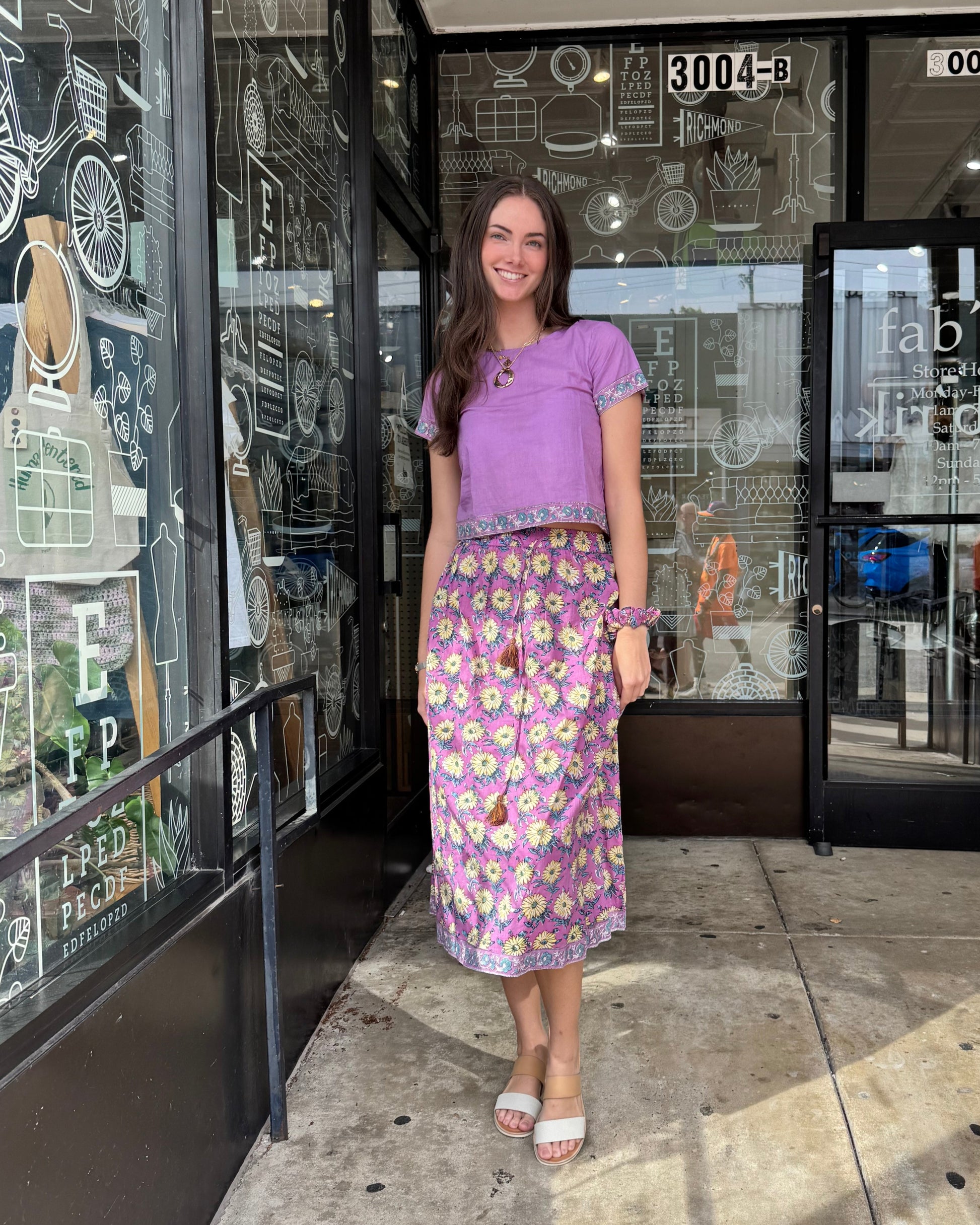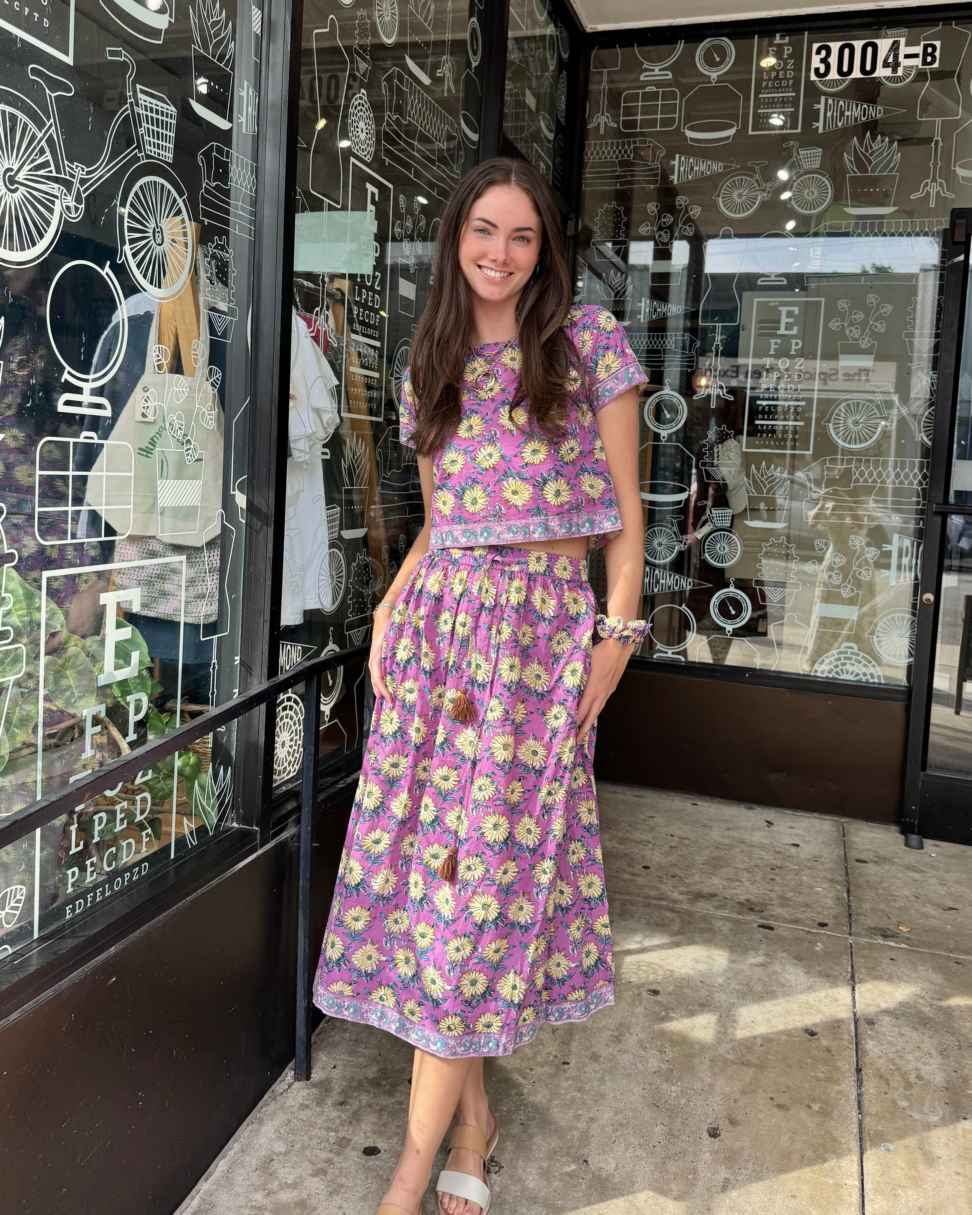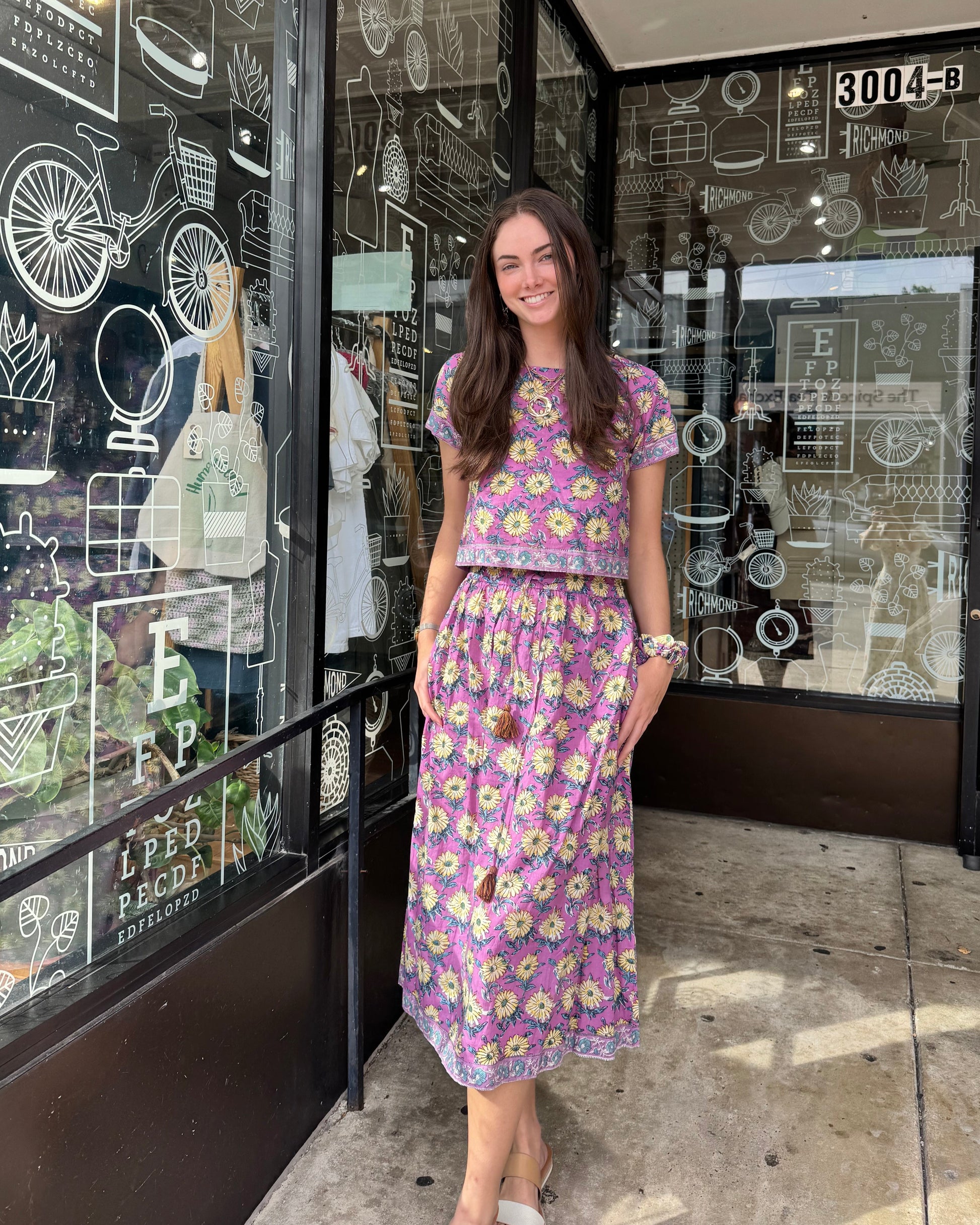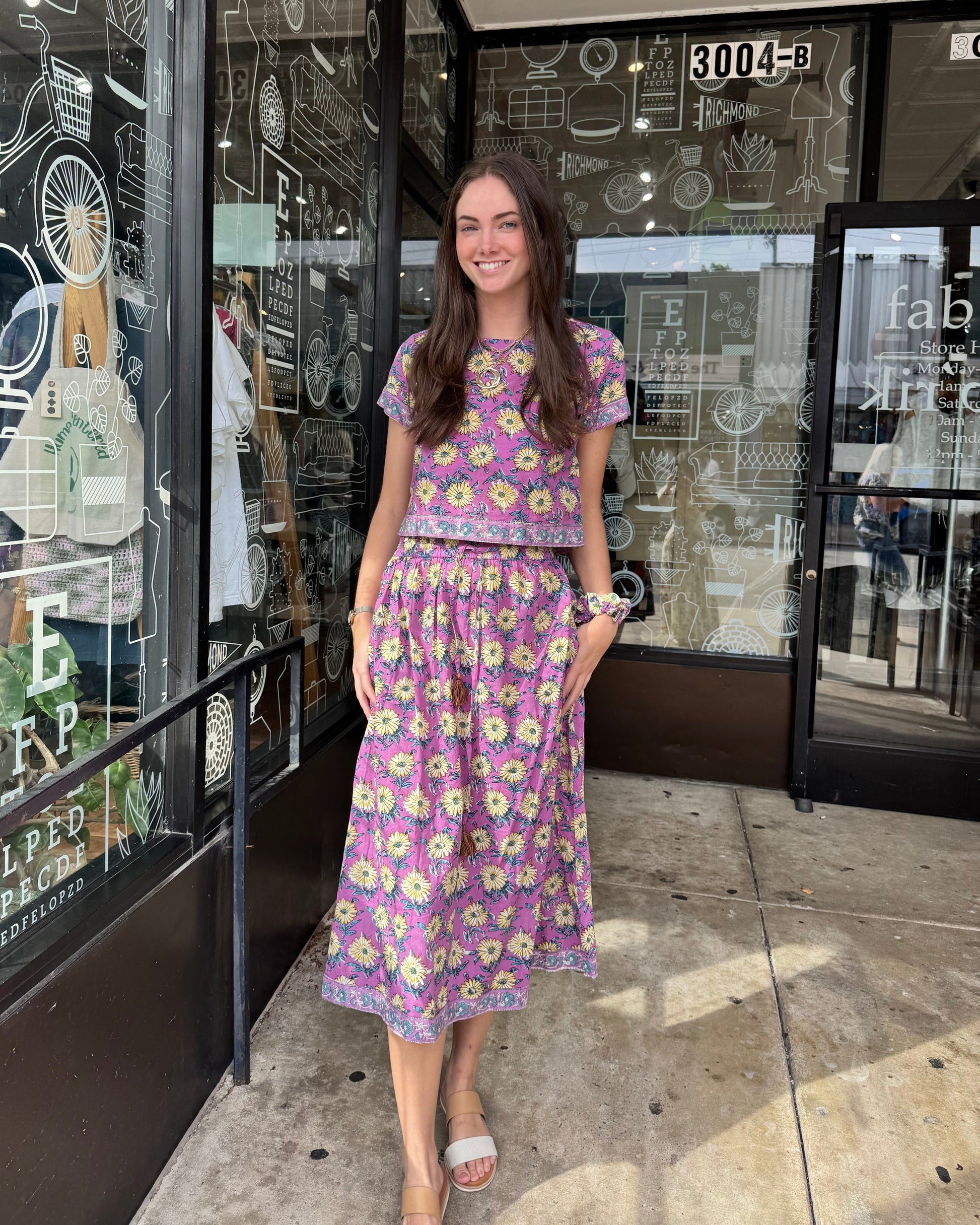 The Lilac Breeze Set blends charm and comfort in every detail. Featuring a flowy floral skirt with practical pockets and two thoughtfully designed tops to mix and match, this set is your go-to for effortless elegance.