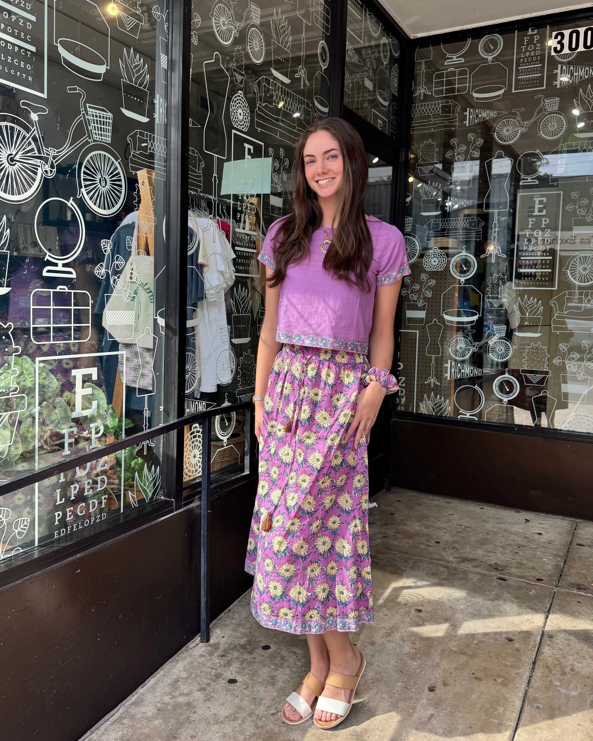 Handcrafted in breathable cotton and printed using traditional hand-block techniques, the lilac tones and daisy motifs capture the carefree joy of a day well spent.