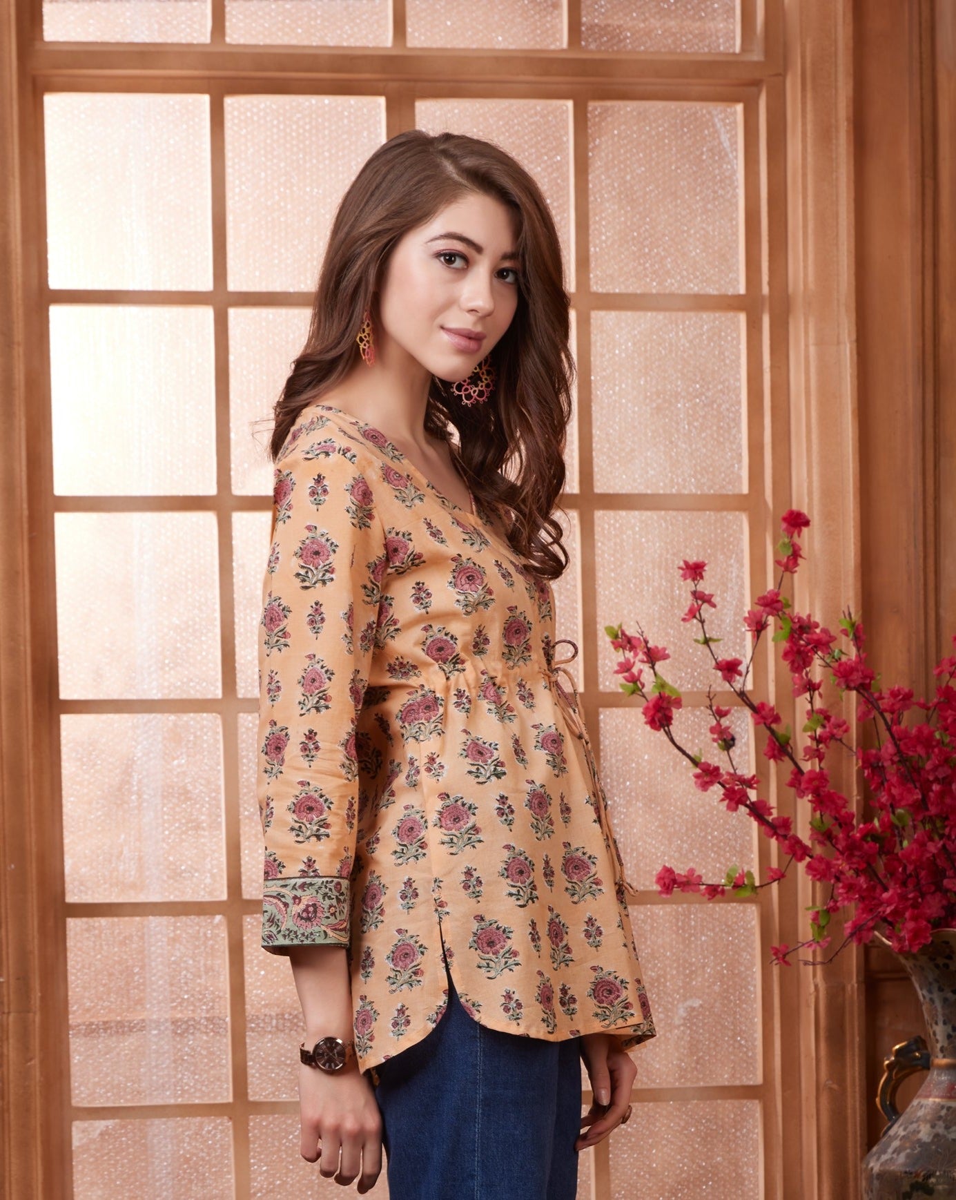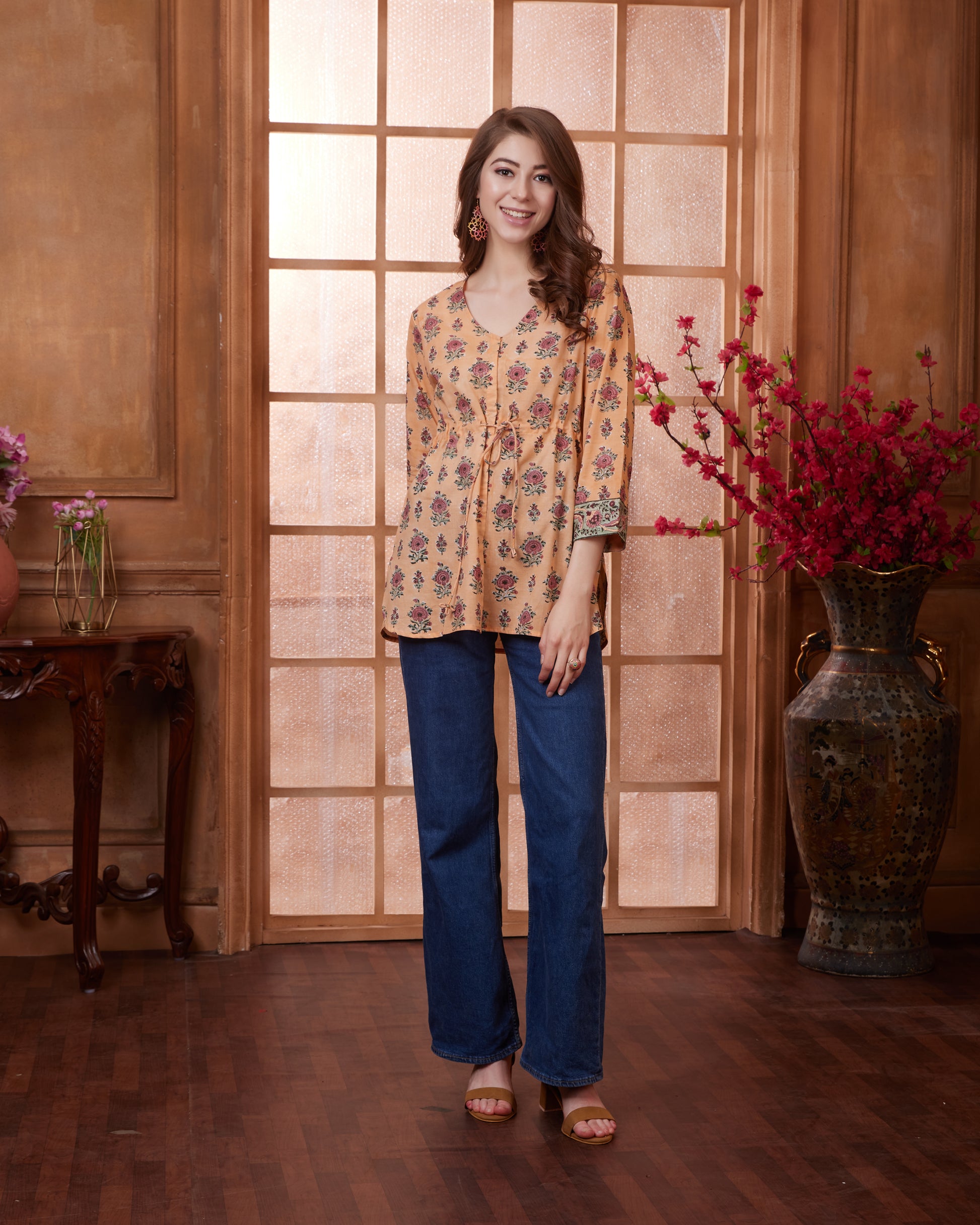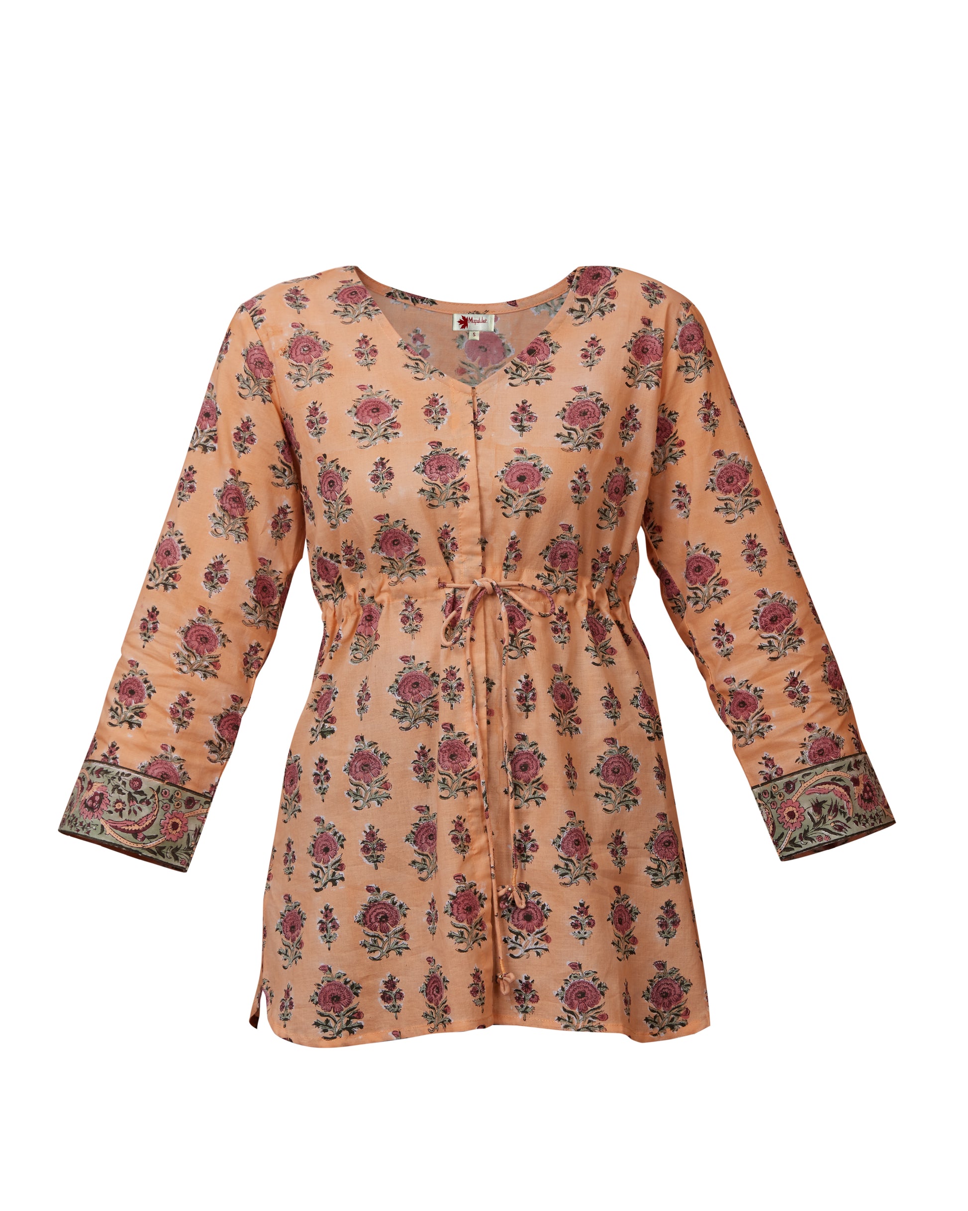 Experience effortless elegance with the Ally Top, featuring an adjustable waist tie, V-neckline, 3/4 sleeves, and a curved hem with a side slit. Crafted from lightweight cotton, it ensures comfort and confidence. Embrace the peachy hue and celebrate your limitless potential.