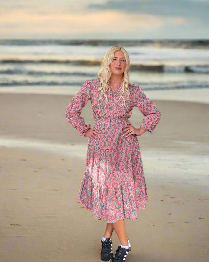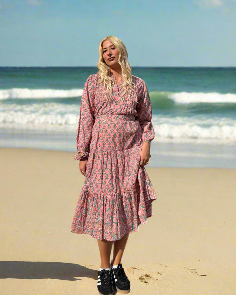 The Tiara Dress is a stunning midi-length design that showcases soft hand-block prints and a flowing silhouette. With a gathered bodice, long ruffled sleeves, and intricate detailing, this dress exudes refined elegance. Perfect for making a statement at any occasion, the Tiara Dress adds a regal touch to your wardrobe.